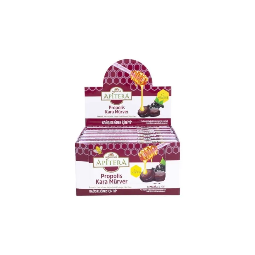 Doğal bal-propolis içerikli Apitera Pastil; kara mürver, zerdeçal, karabiber ve C vitamini ile zenginleştirilmiş, günlük kullanım için ideal bir takviye edici gıdadır.