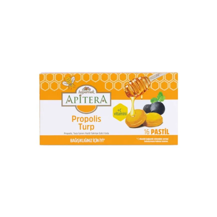 Doğal bal ve propolis içerikli Apitera Pastil; turp, kurkumin, kır iğdesi yağı ve C vitamini ile zenginleştirilmiş, günlük kullanım için ideal bir takviye edici gıdadır.
