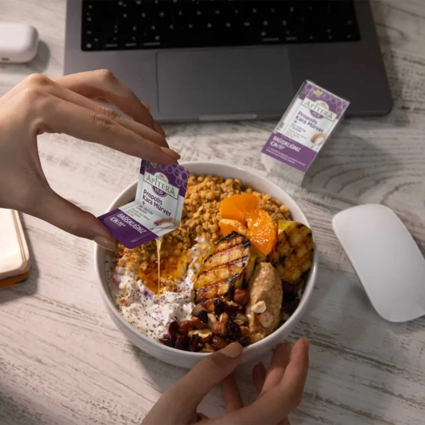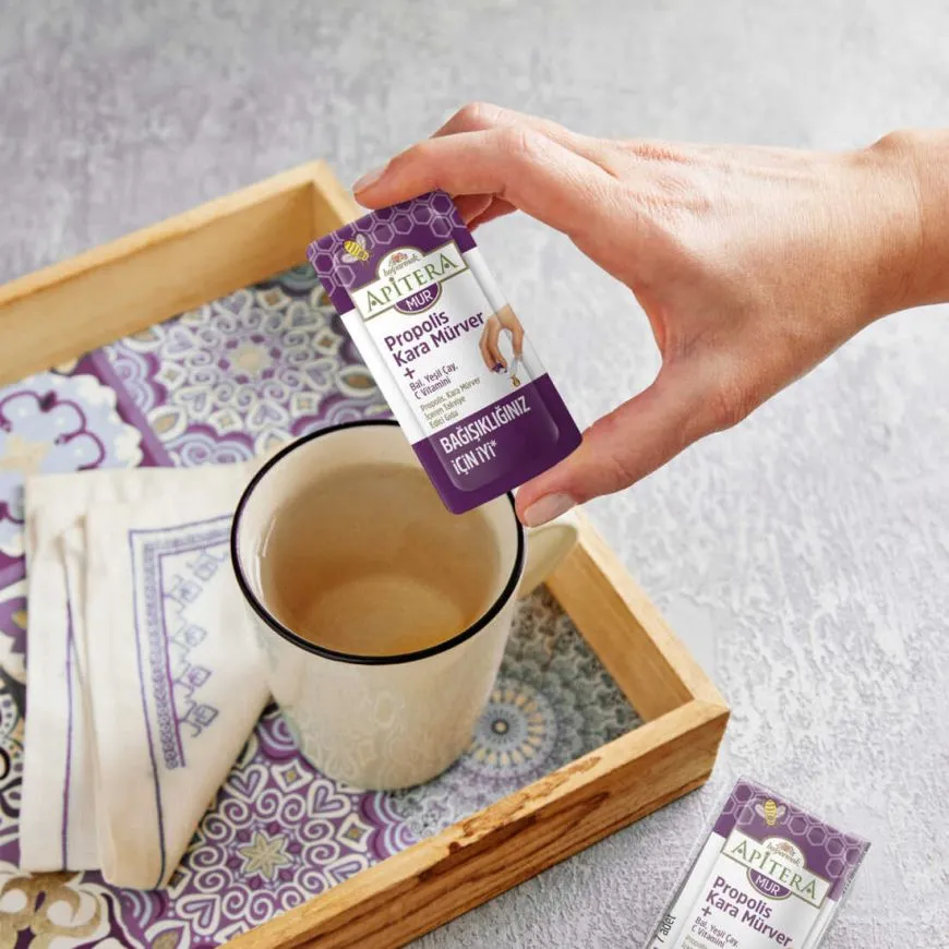 Doğanın arılar yoluyla insanlığa armağan ettiği bal ve propolis, kara mürver ve yeşil çay ile birleşerek bir araya geliyor! Uygun dozlarda ve tek kullanımlık ambalajlarda sunulan Apitera MUR, pratik kullanım imkânı sunmakla birlikte; akıllarda hijyene ve doz aşımına dair soru işareti de bırakmıyor.
